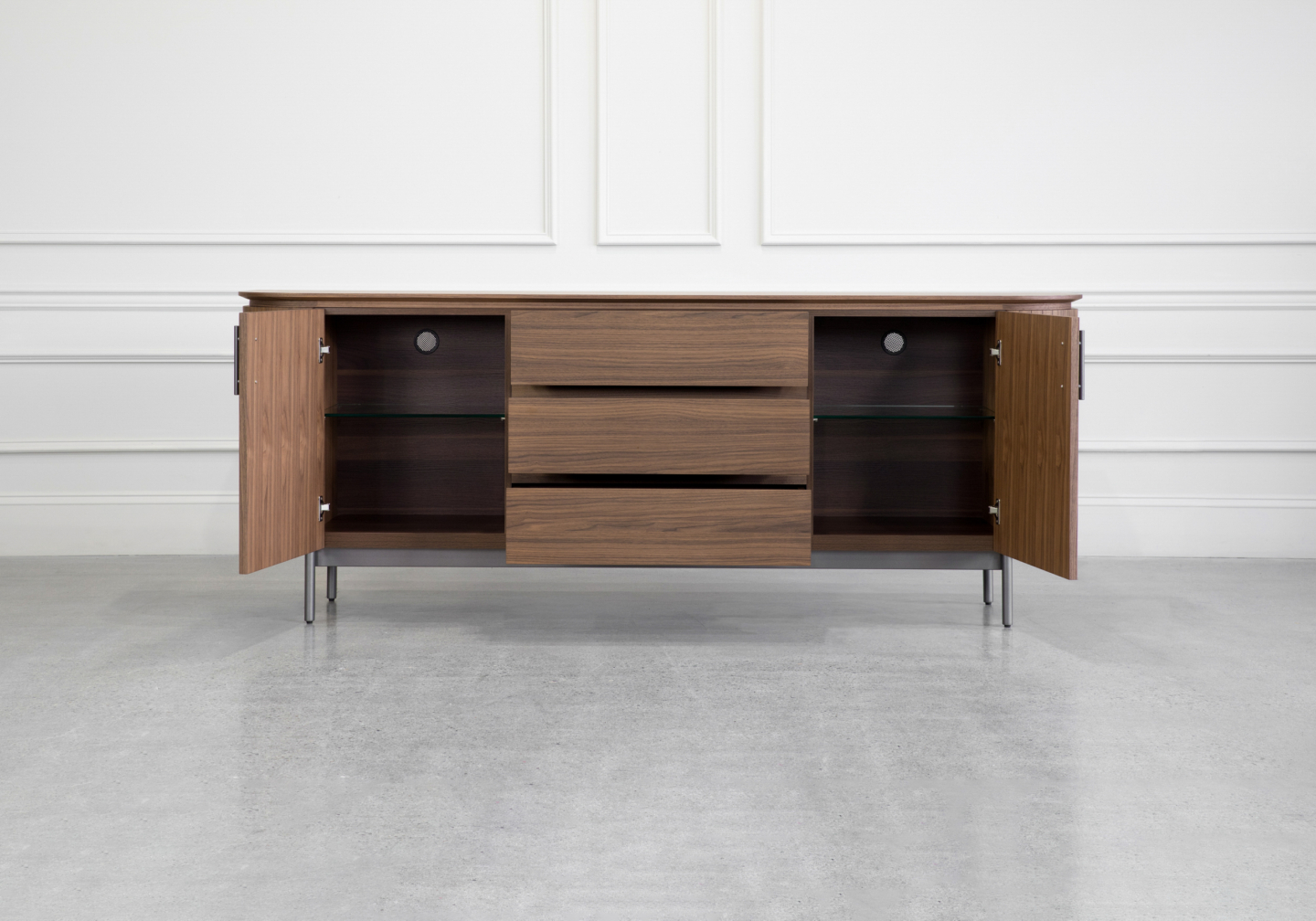 The sideboard is equipped with great storing space, shelves, and a soft-close drawer.